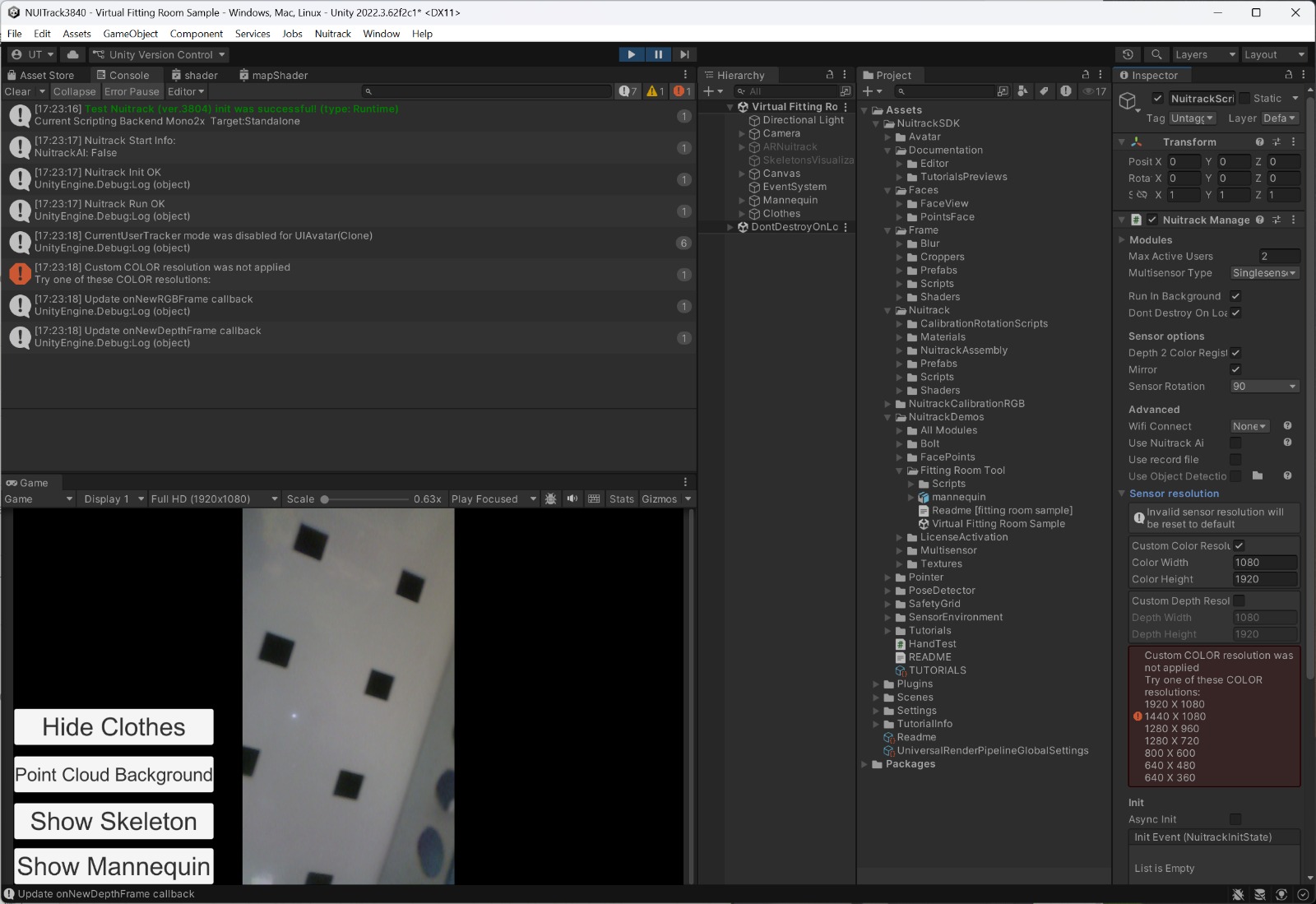 It work fine after edit nuitrack.config and set custom color resolution to false