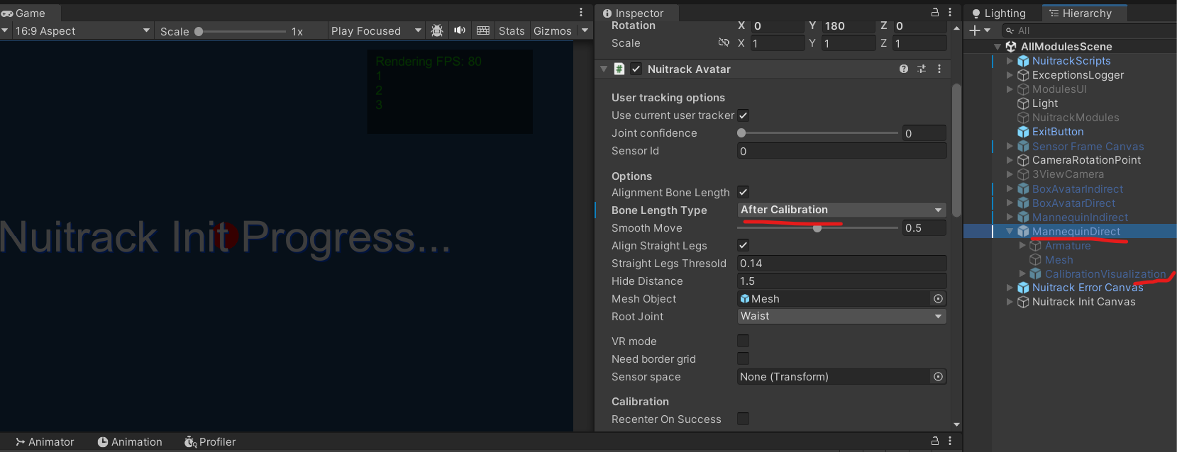 The jittering is happening everywhere, even in the example/demo scenes of the NuitrackSDK. The wrong rescaling is partially also happening in for example the All Modules Scene. There, the body of the mannequin is also a bit weirdly stretched. It’s not as extreme as in my own scene with my own models though, but it’s stil also happening there.